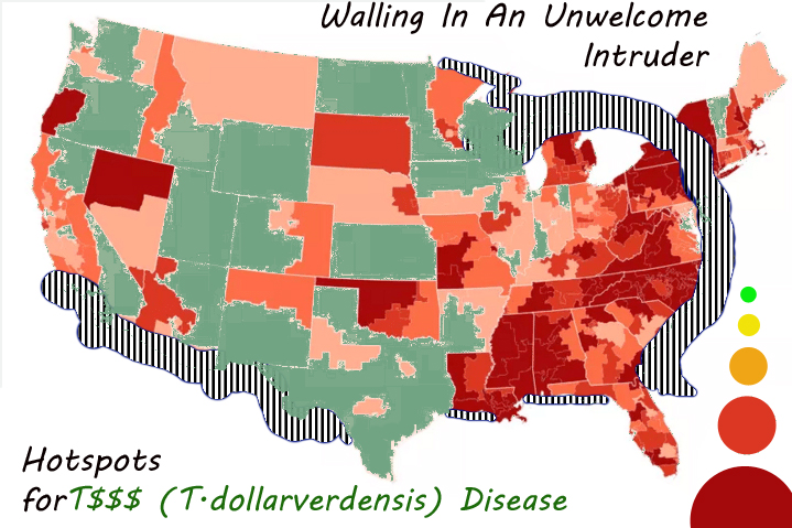 Dr. W: In this case, T. dollar-verdensis will be contained to the US, for sure. A wall is being built as we speak (see map) although genetics indicate that the host range of this organism may be confined to the 50 states that make up the US. But you can never be too careful!