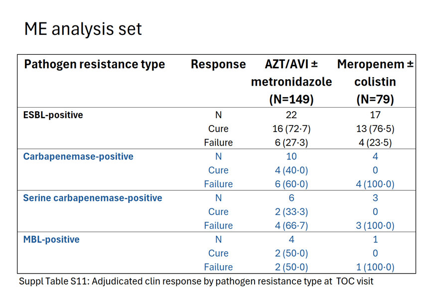 As obvious from the table, the study found hardly any MBL producers, the main reason for existence of Emblaveo. In addition, how should we interpret the data given the extremely small number of microbiologically evaluable cases? Outcome was adjudicated by blinded reviewers, an important quality marker of the study; hence, we can trust their assessment. That said, the rather high percentage of clinical failures in the MBL and carbapenemase-positive subgroups is nothing to be proud of. Again, the numbers are too small to draw any conclusions.